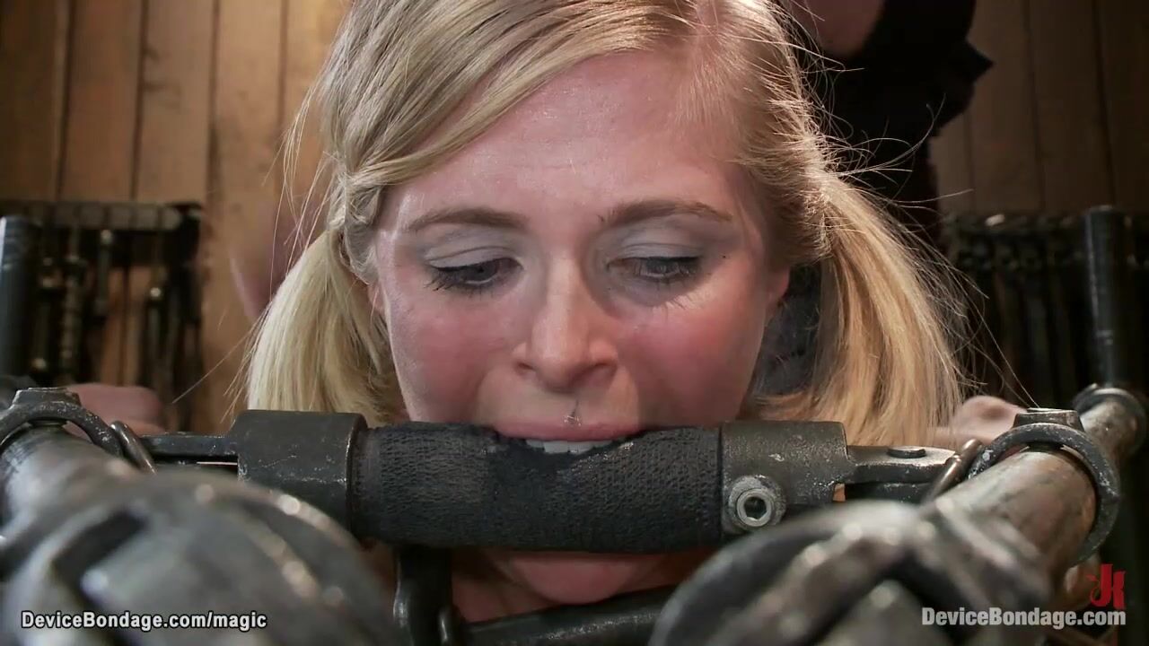 Busty blonde in metal device ass fucked