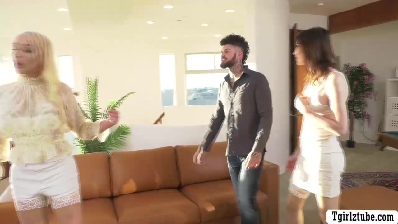 Two gorgeous shemales got rescue by stranger because their car didnt start.They bring him into their place and then they start kissing him and throat his hard big cock passionately.Next is,they bareback each others ass on the couch.