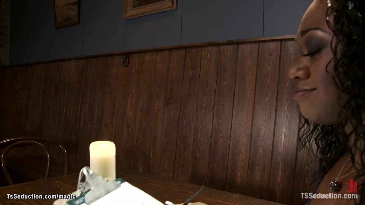 Ebony shemale Janet Jackme met white man Acheron Krosser at blind date and brought him home then with big black cock fucked him in mouth and ass