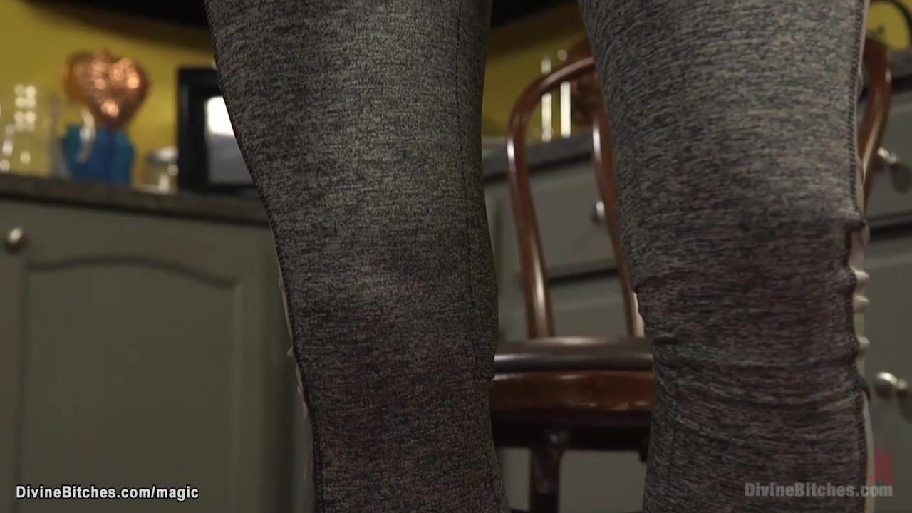 Hot brunette wife in black lingerie Veruca James dominates her rich husband DJ at home and makes him write a check then with strap on cock pegs him in the kitchen