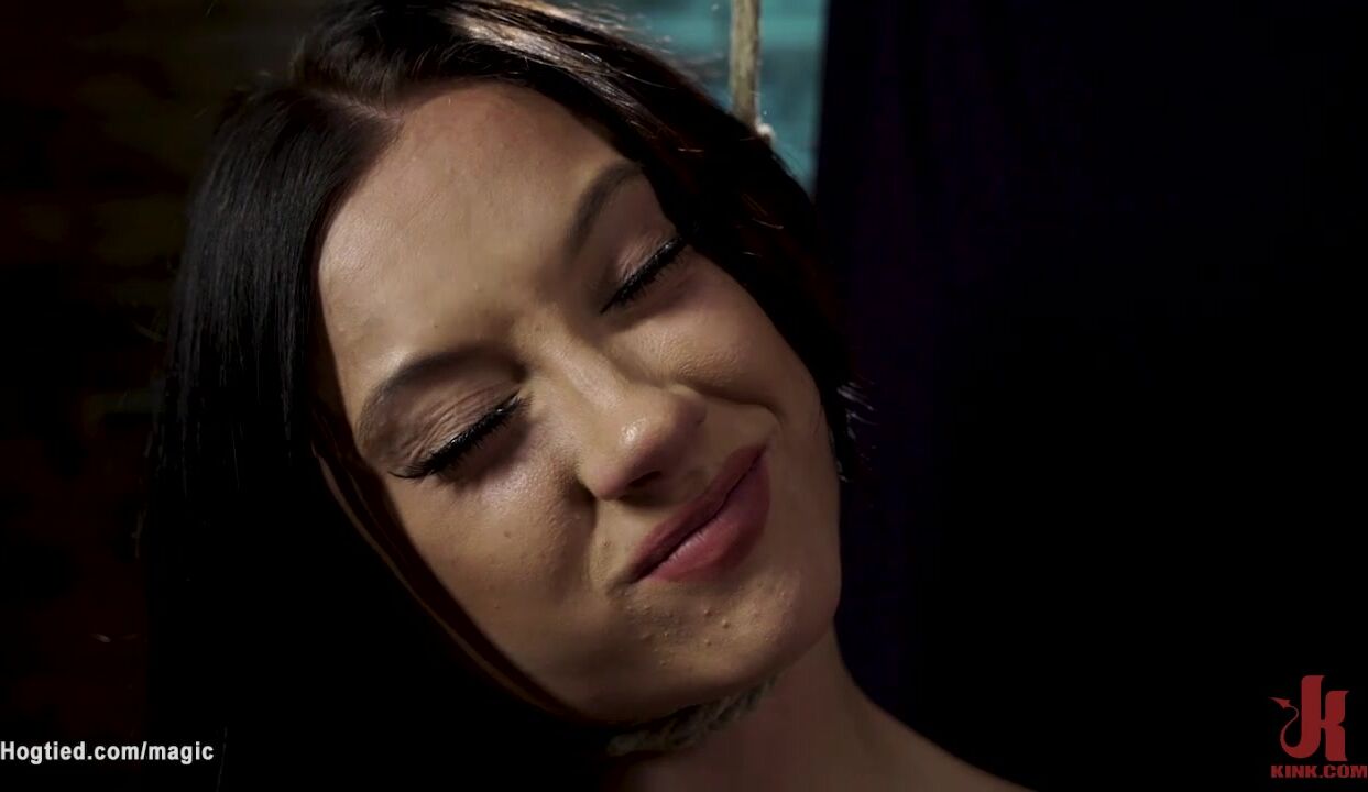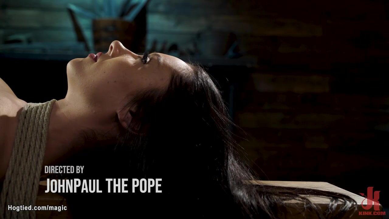 Brunette slave Jazmin Luv begins lying down with her legs and arms pulled and bound to the floor gets shaved pussy exposed for whipping and master The Pope