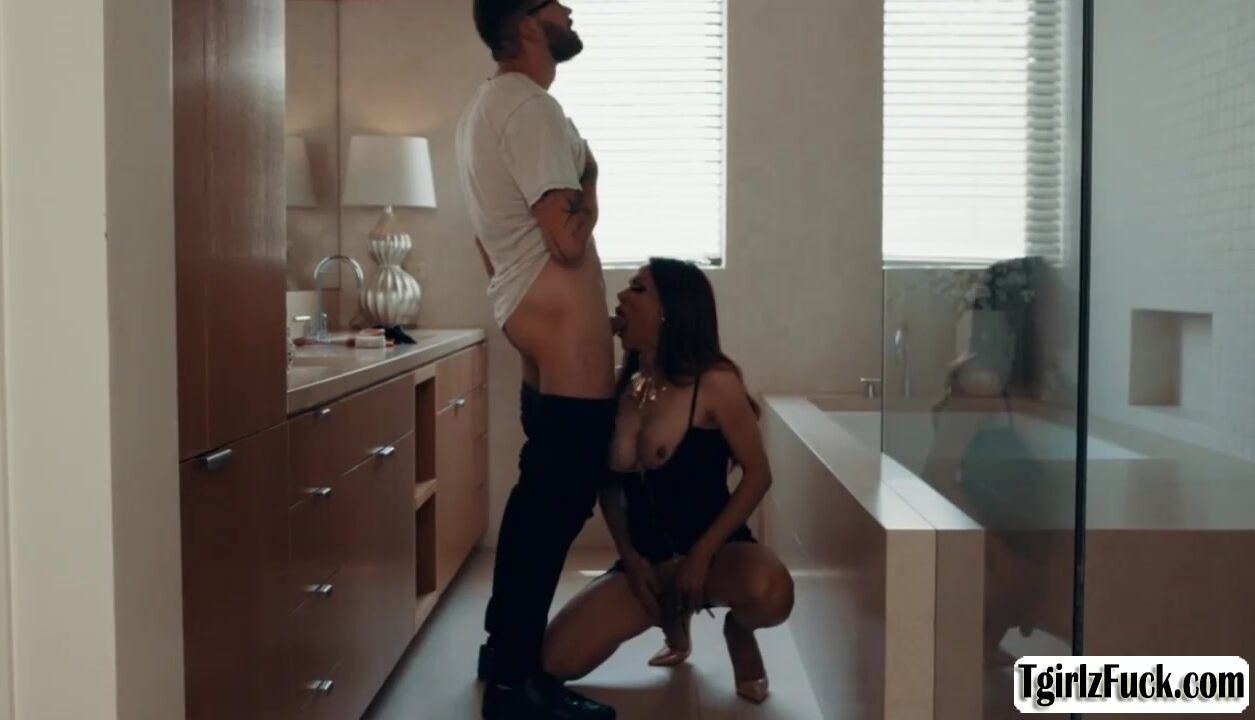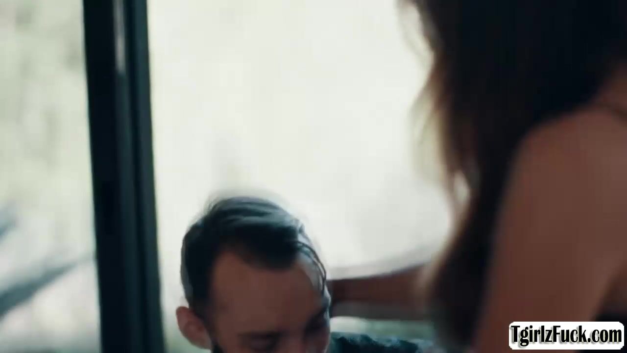 Busty brunette tgirl Sofia Sanders deepthroats stepsons cock