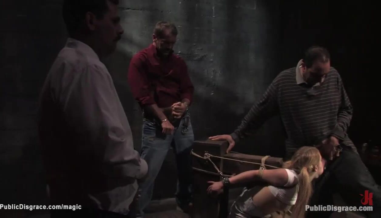 Bound pigtailed blond teen Ally Ann sucking huge dicks to strangers then they anal gang bang fuck her and cum on her face in public