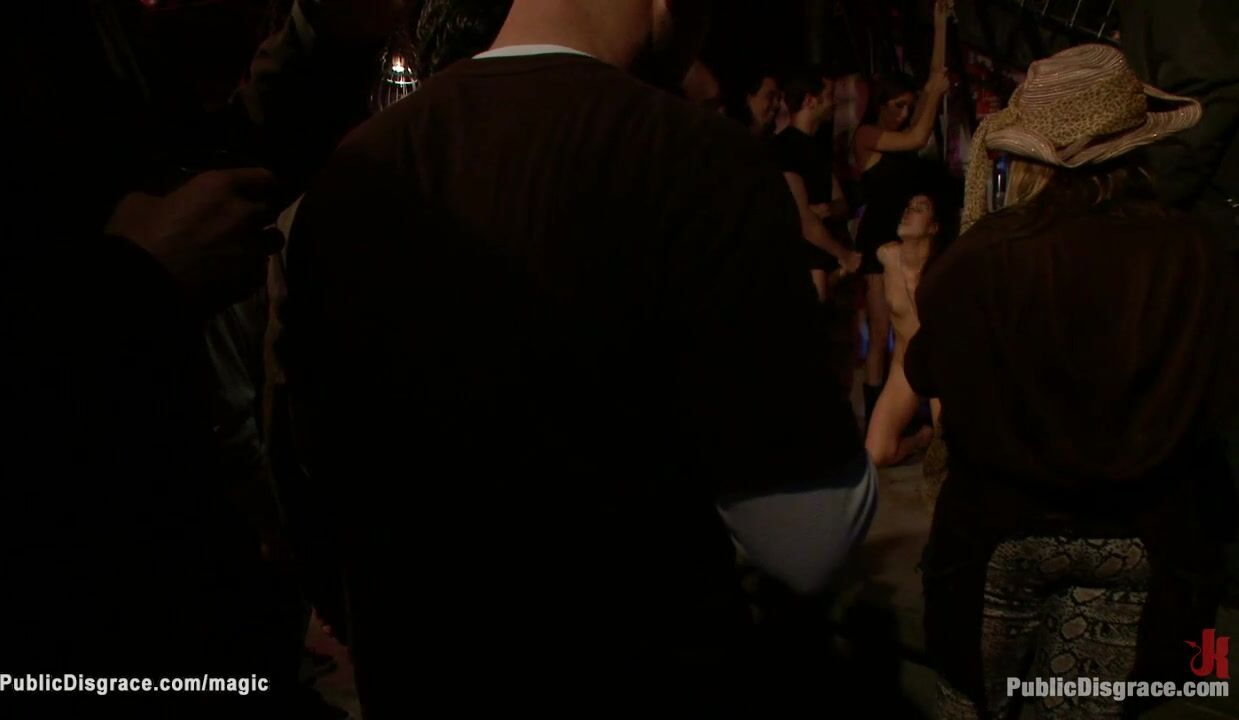Brunette babe Lou Charmelle is blindfolded and bound down on knees then deep throat fucked then in rope bondage on back anal fucked in public place