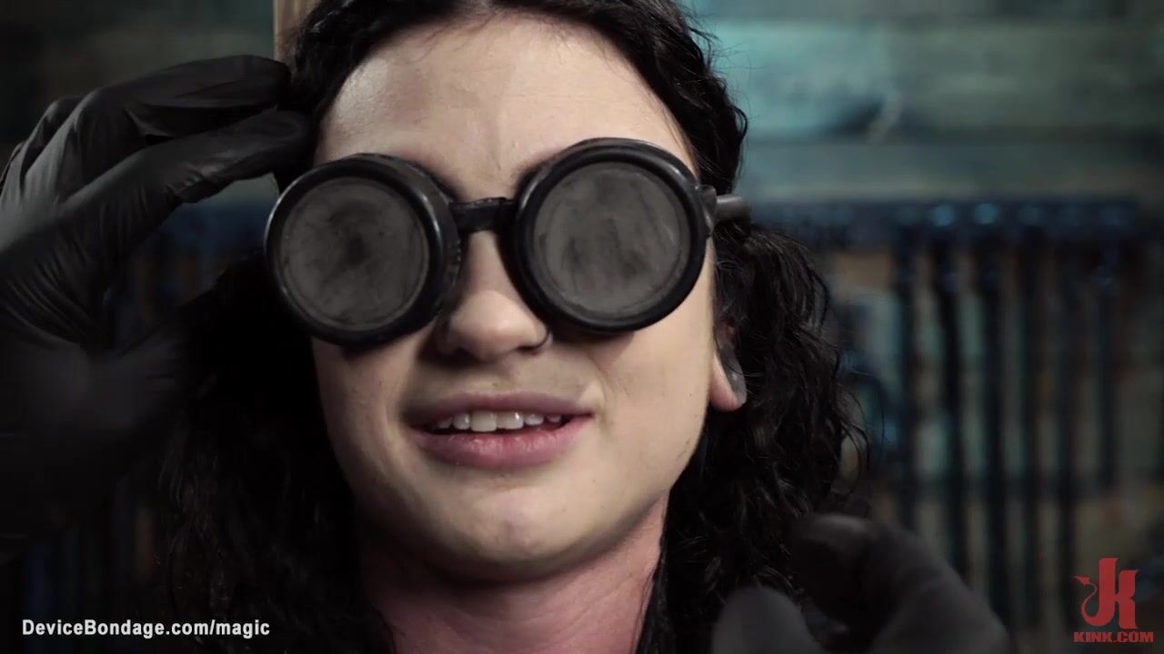 Pale brunette slave Lydia Black bound in metal device gets gagged with dick on a stick then in pile driver position whipped by master The Pope