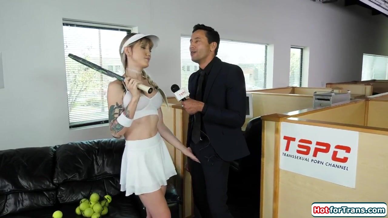 Shemale tennisplayer Lena Moon shows the reporter what her favorite balls are.The busty tgirl gives a blowjob.The big tits trans is rimmed and gets her tranny cock deepthroated.The blonde tattooed ts babe is anal reamed by the guys big cock