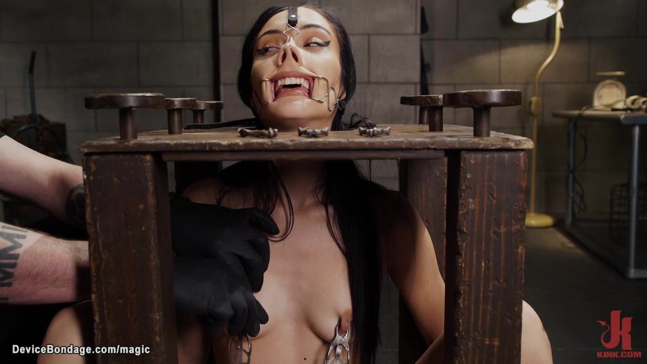 Brunette beauty Jazmin Luv is bound in bondage cube and nose and mouth spreaded and nipples clamped then bent over pussy fingered by master The Pope on device bondage