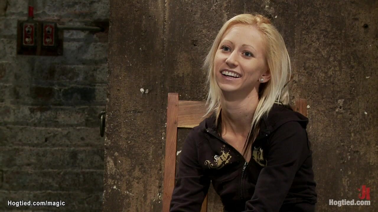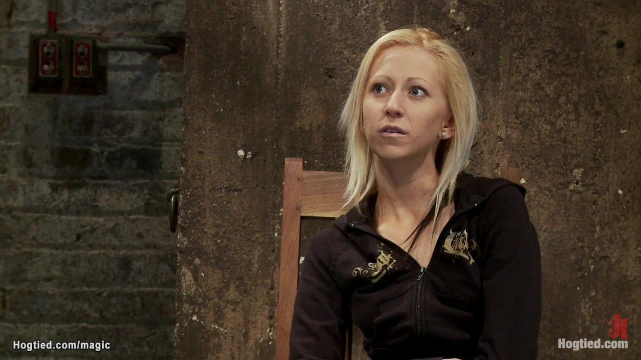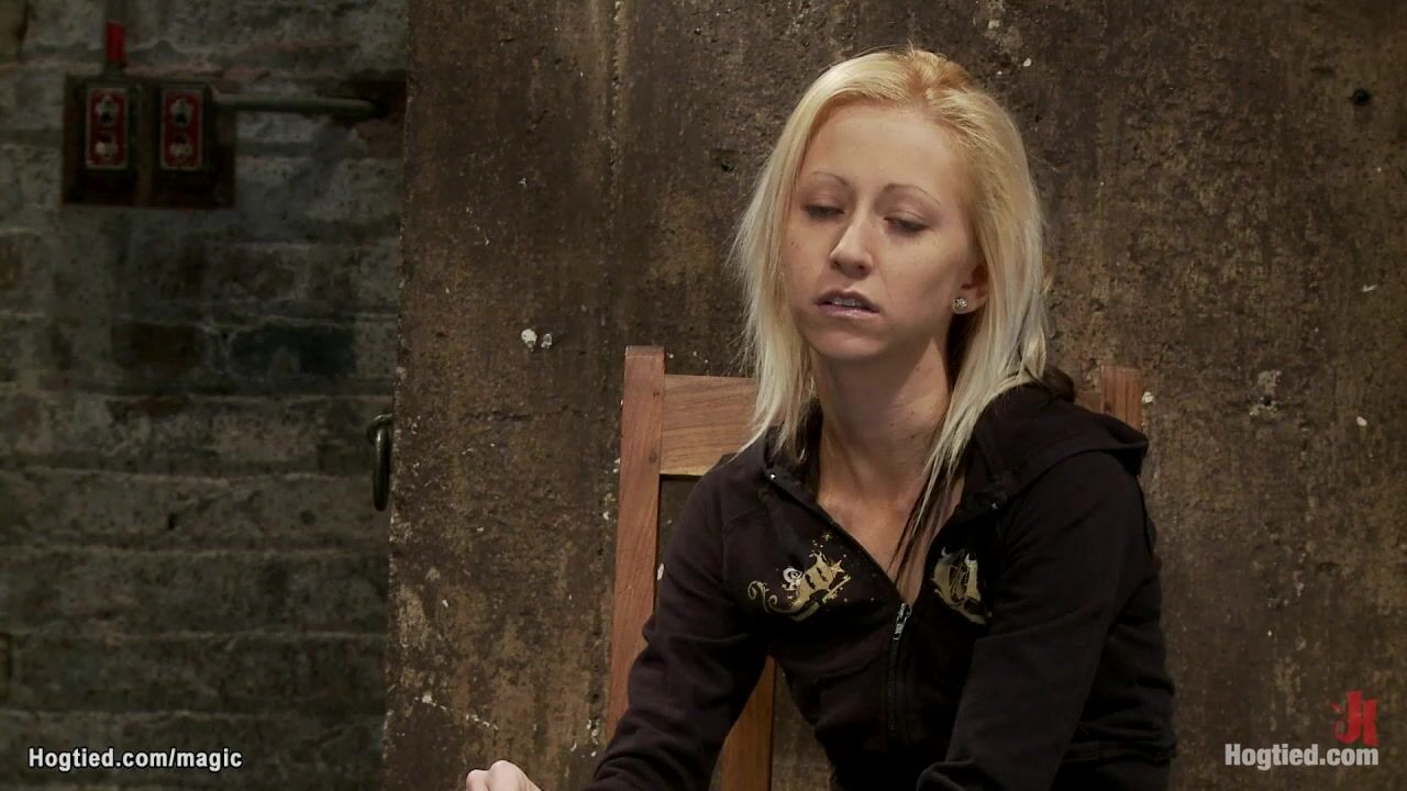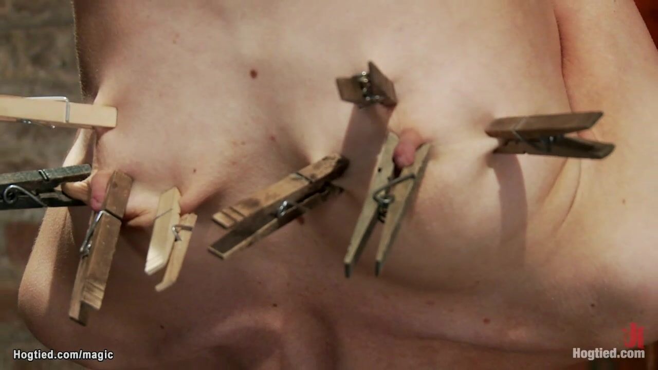 Hung for ankles in upside down position small tits blonde slave Rene Phoenix gets crotch roped and nipples clamped by master Matt Williams on hogtied