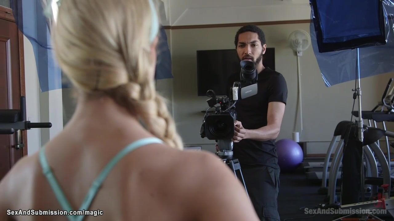 Black camera man Mickey Mod shooting sexy ass blonde MILF Cherie DeVille in the gym then fucking her mouth and pussy with bbc in rope bondage