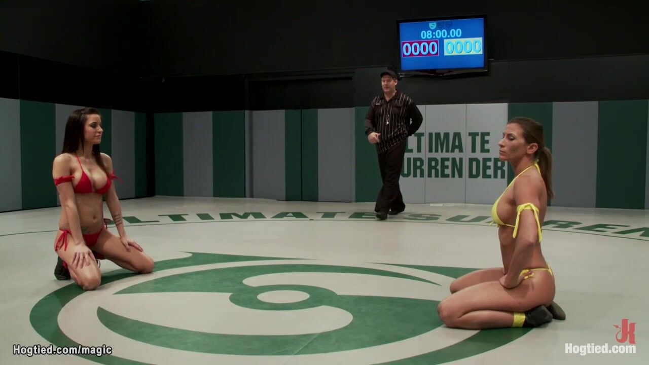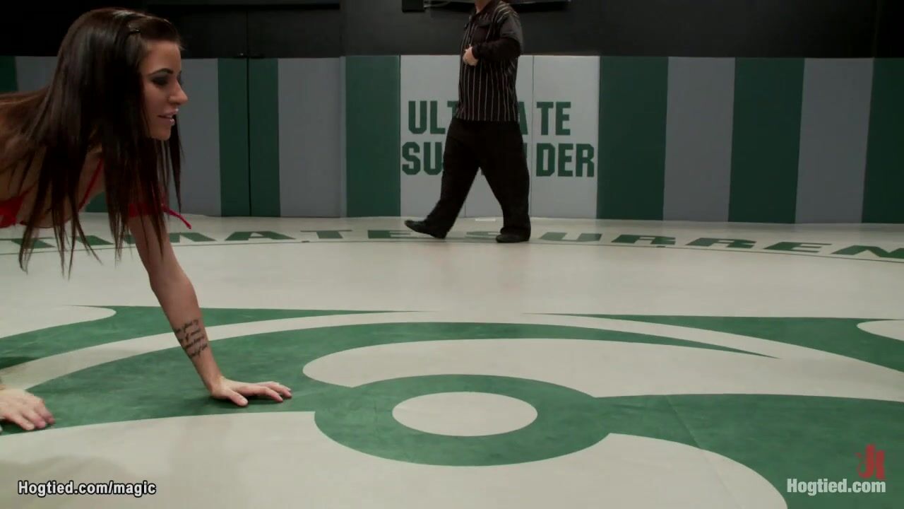 Big tits MILF wrestler Ariel X is strapped in back arch position over acrylic hemisphere and gets shaved pussy whipped then fucked with strap on cock by big tits dom Gia DiMarco