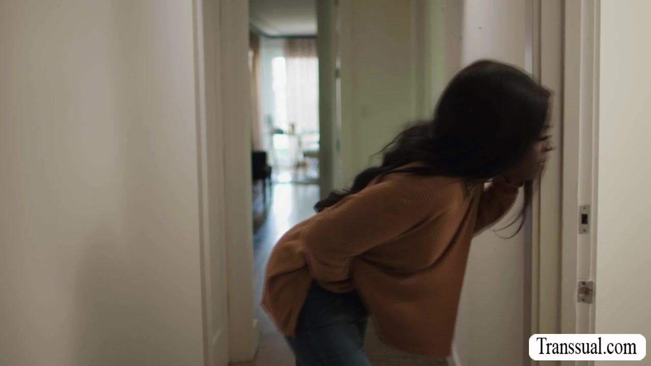 TS ebony saw her shemale roommate jerking off her shecock until she cums on her face.After that,she lets her bend over and she then toys it.Next is,she calls her guy room and lets him bareback fuck their asses so deep and hard.