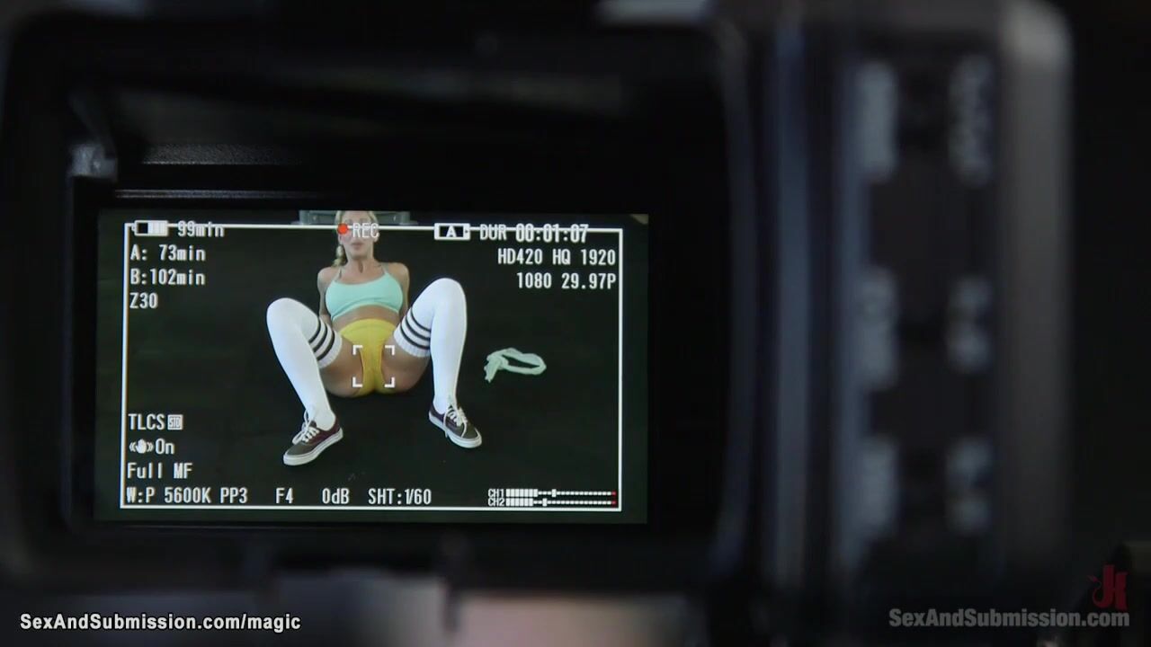 Black camera man Mickey Mod shooting sexy ass blonde MILF Cherie DeVille in the gym then dragging her in dungeon where tormenting her in bondage positions