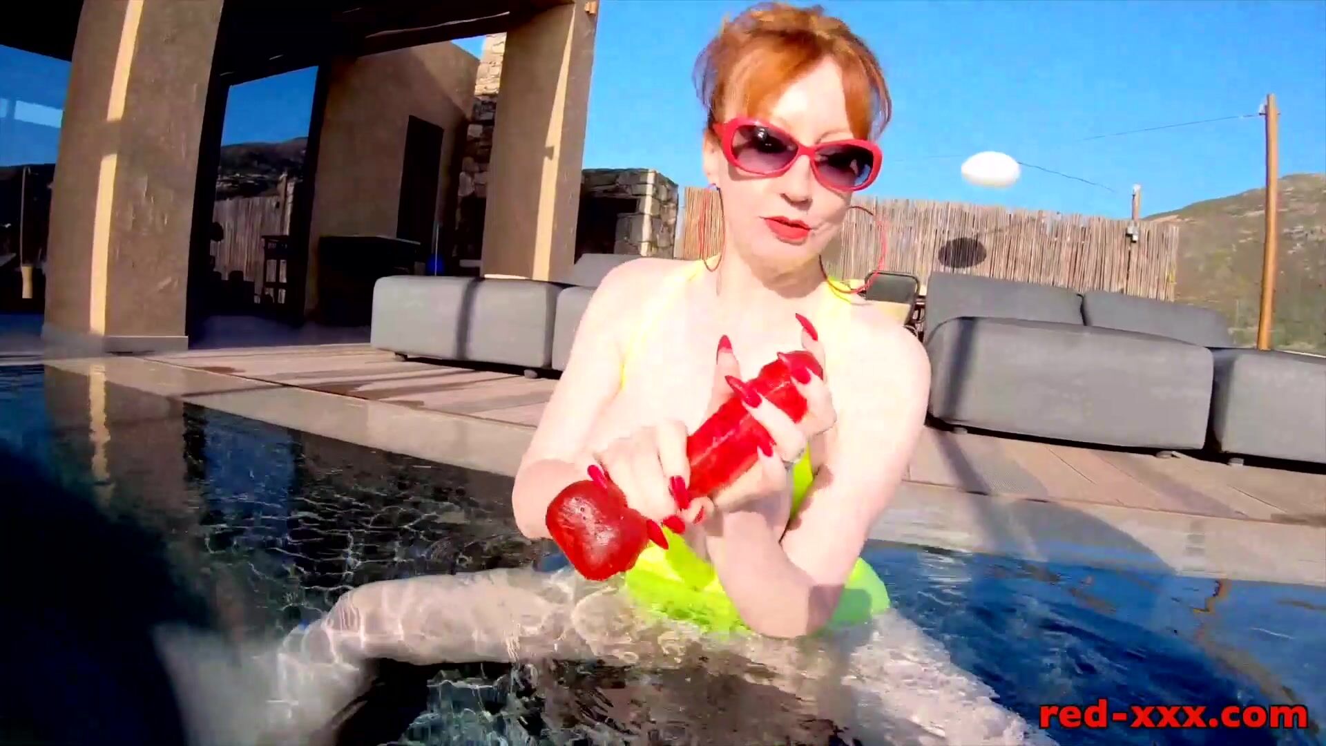 Join Red XXX in the pool on vacation as she gets wet and wild with her fingers and a big red dildo!
