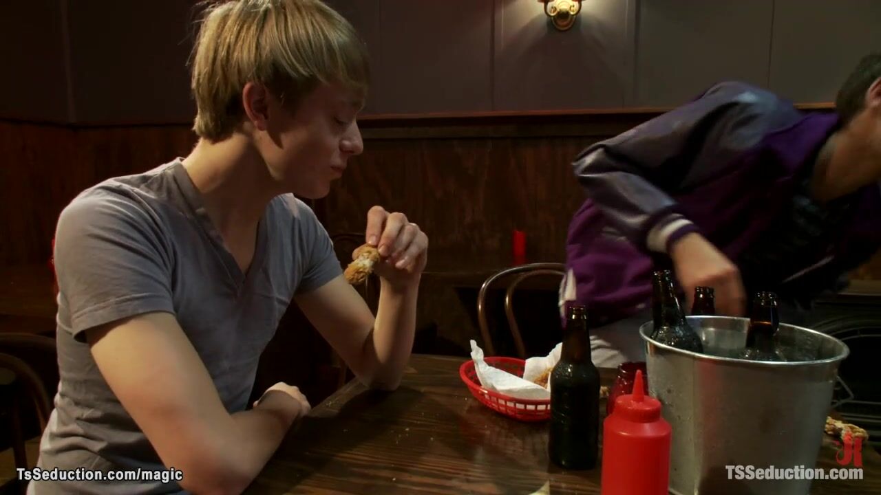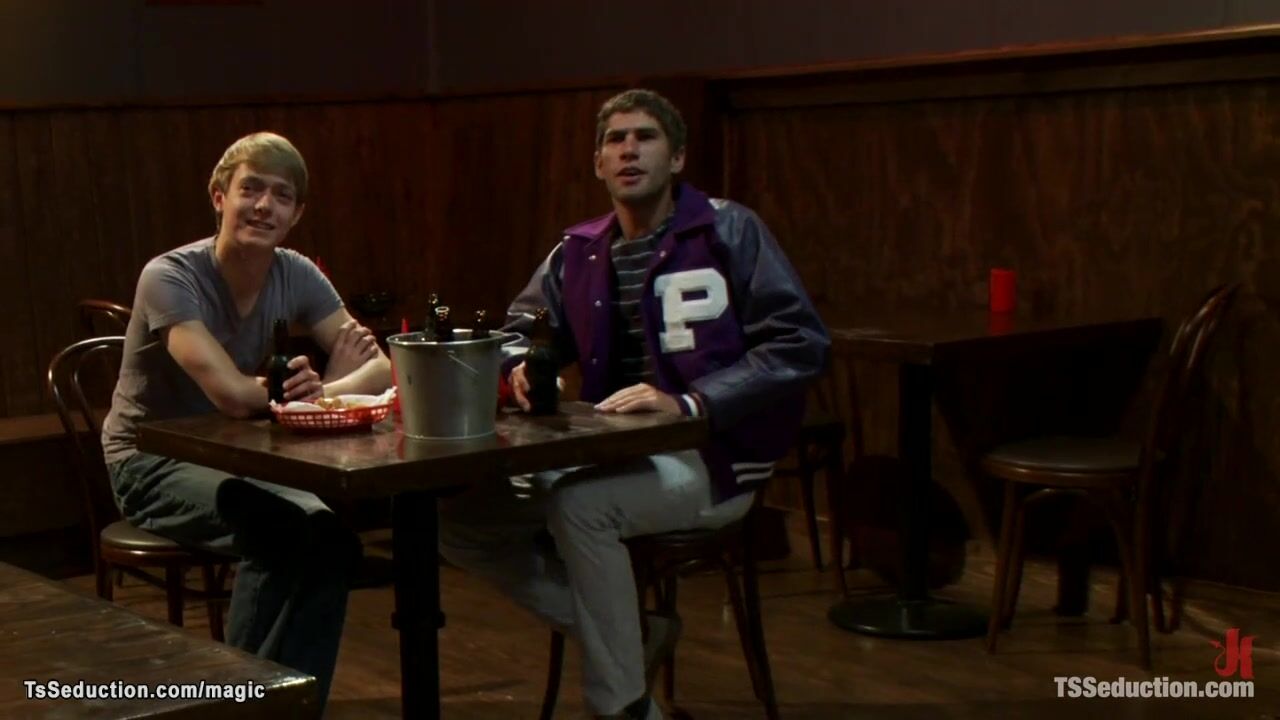 Big tits brunette Asian shemale bartender Yasmine Lee taking two frat college guys Robert Bridges and Koby Nolan and fucking them in bondage in bar after working time