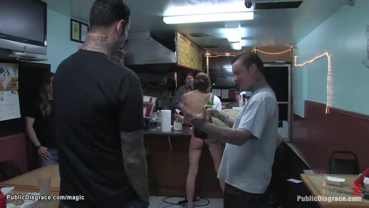 Skinny brunette slut Delilah Knight is anal fisted on counter then gang bang fucked by big cocks of master Mark Davis and strangers in public restaurant