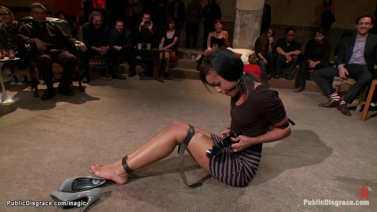 Princess Donna Dolore straps hot brunette slave Skin Diamond in crowded public place then big cock James Deen fucks her with big cock strangers in group action