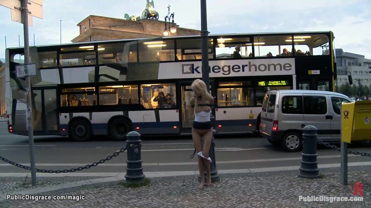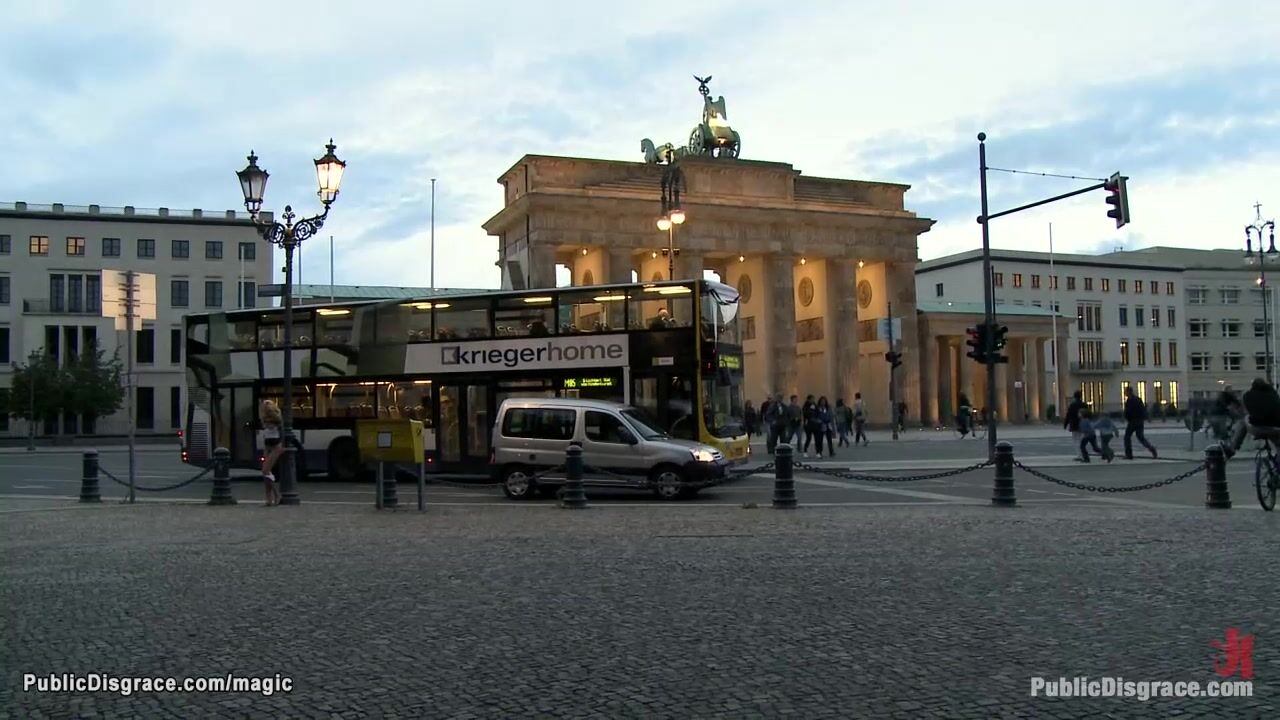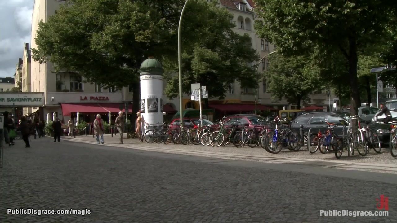 Slim small tits blonde Euro babe Blanche is bound naked in the city center and poses for viewers then in the park fucked on the bench by big cock master Zenza Raggi