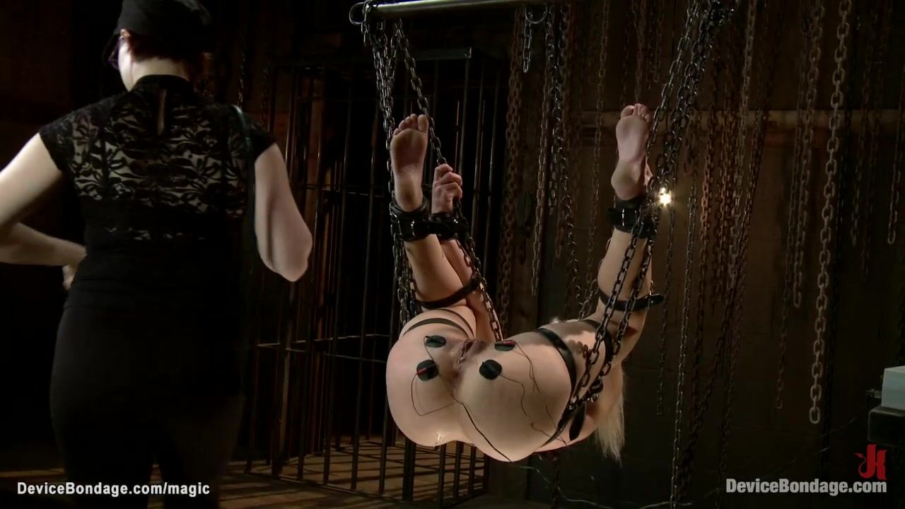 Blonde lesbian slave Anikka Albrite is bound in straitjacket and chained gets bare feet candle waxed then suspended and fucked with inflatable sex toy by lezdom Claire Adams