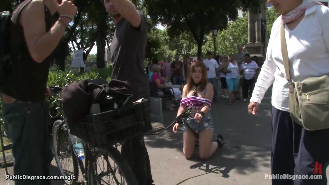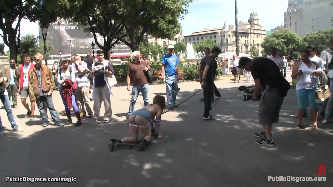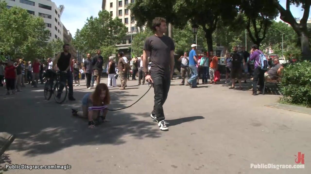 Little young European babe Dulce Mariposa is bound and walked on a leash on all four in public then anal fucked by her master James Deen and his big cock all over the city