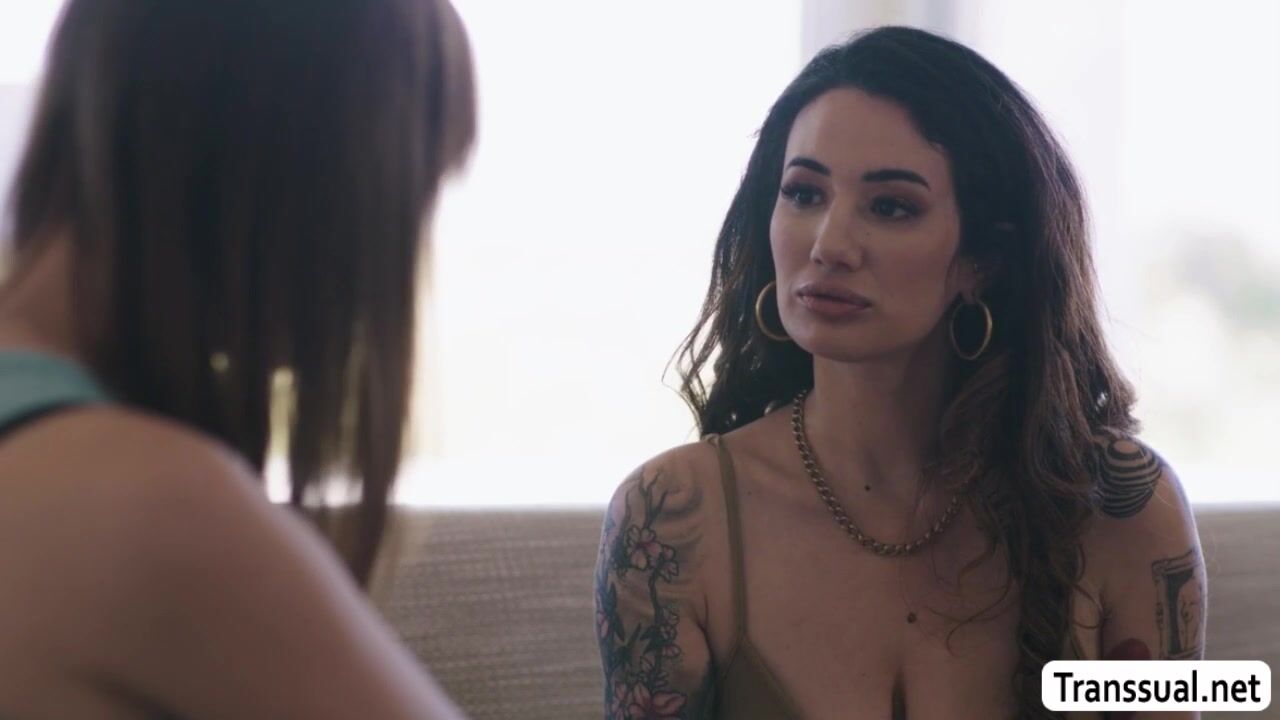 MILF tattooed comforts her TS stepdaughter by kissing her passionately.After that,she lets her TS stepdaughter suck her nipples and in return,she throats his hard shecock.Next is,her TS stepdaughter licks her pussy and fucks it so hard.