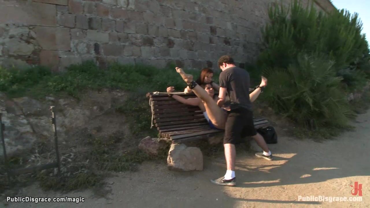 Handcuffed and gagged Spanish slave Salma de Nora walked through public streets bare boobs and without panties then anal fucked by big cock master James Deen and dom Princess Donna Dolore
