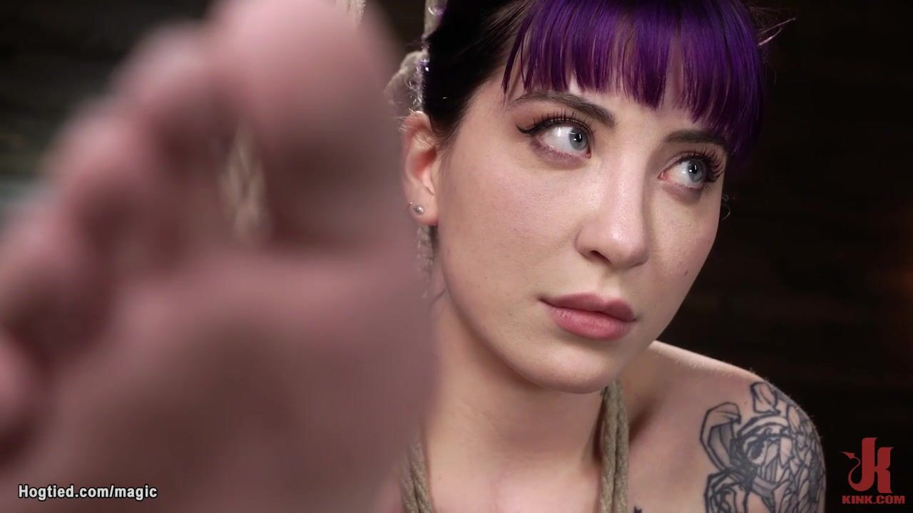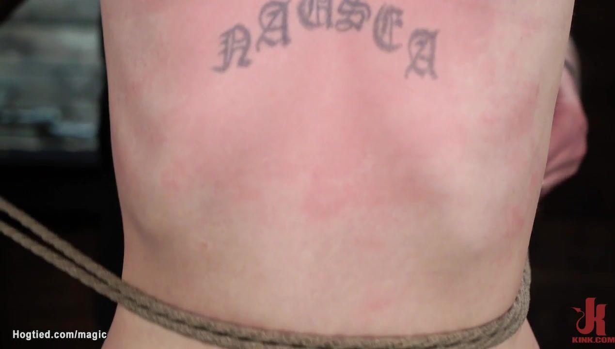 Tattooed slave Charlotte Sartre is bound for wooden column and hot ass flogged then legs bent and pulled in the air then suspended for ankles in upside down position by master The Pope on hogtied