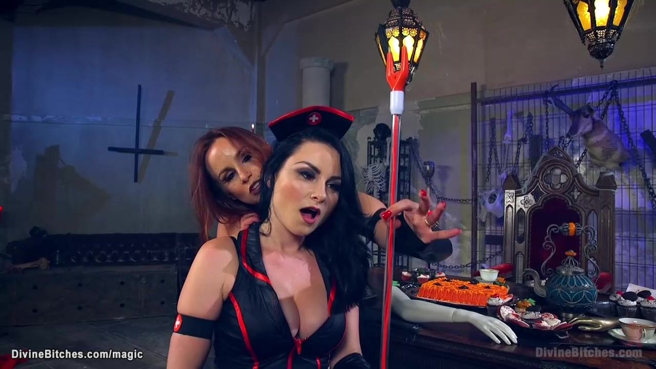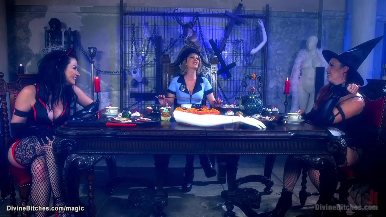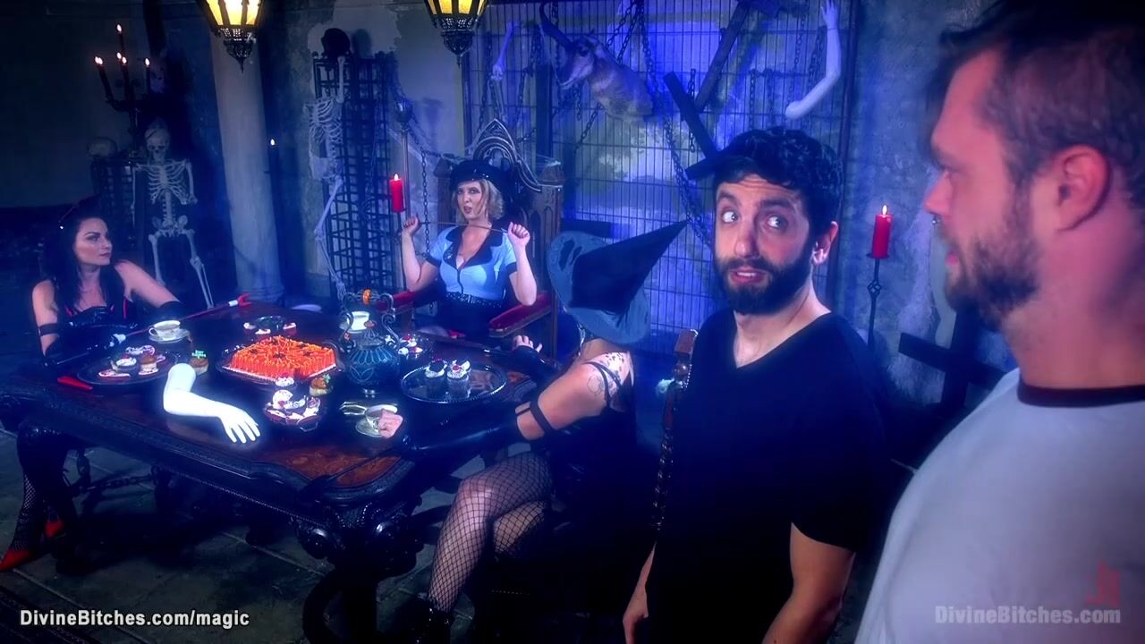 Two naive men are invited to Halloween femdom tea party by femdoms Bella Rossi and Cherry Torn and Veruca James and then pegged and whipped and humiliated