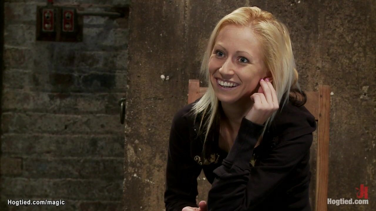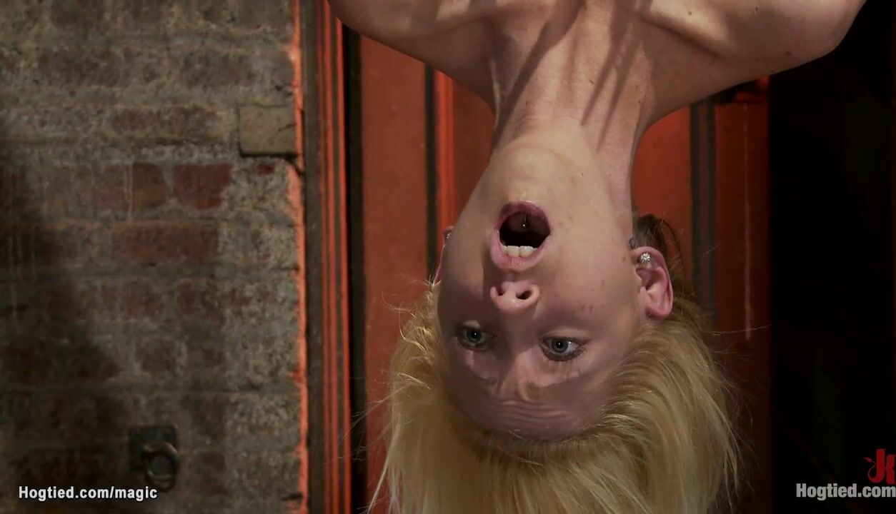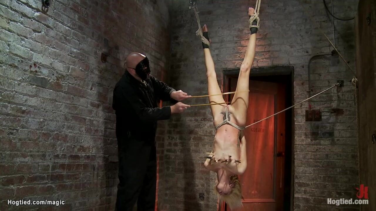 Slim blonde slave Rene Phoenix with small titties is bound and suspended in upside down position with crotch roped then hard caned by master Matt Williams