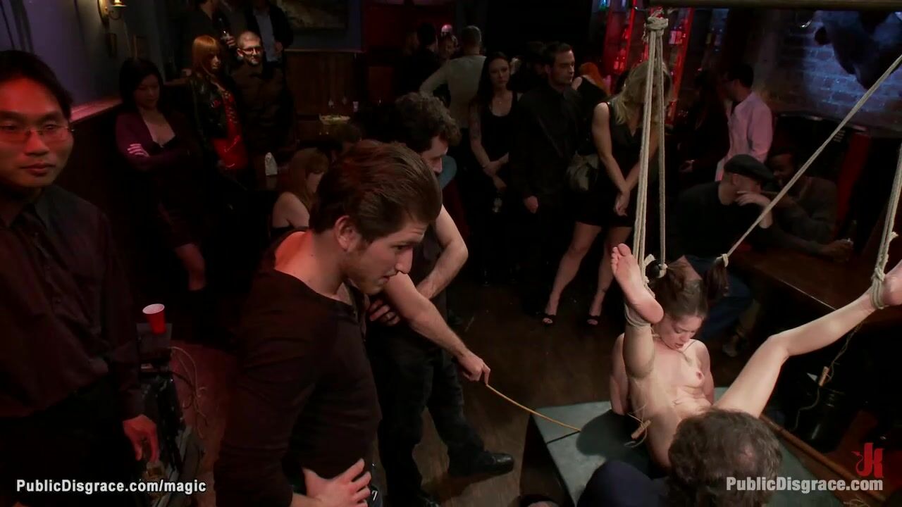 Zippered and bound babe Jessi Palmer gets fucked with dick on a stick by Princess Donna Dolore then rough fucked by big cocks of strangers in public crowded bar