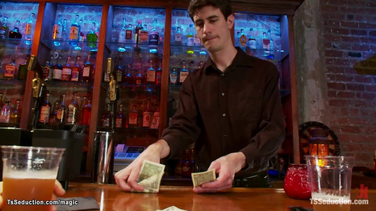 Dominant tall big boobs brunette shemale Morgan Bailey seduces Chris Ockham after work at his bar and with big dick fucks him in mouth and ass on the table full of money