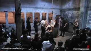 Service slave Sarah Shevon gets throat fucked by big cock strangers while kneeling then bound in doggy position rough fucked till made lick cum from silver plate in public