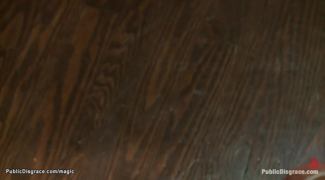 Busty bound brunette slave Vai down on her knees gets throat group fucked then rough big cock and strap on cock fucked till pussy cattle prodded by dom Princess Donna Dolore in public