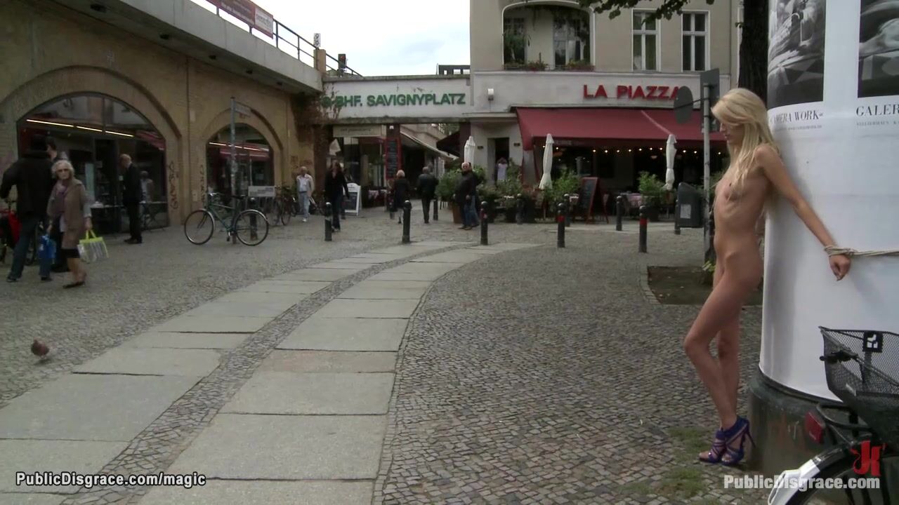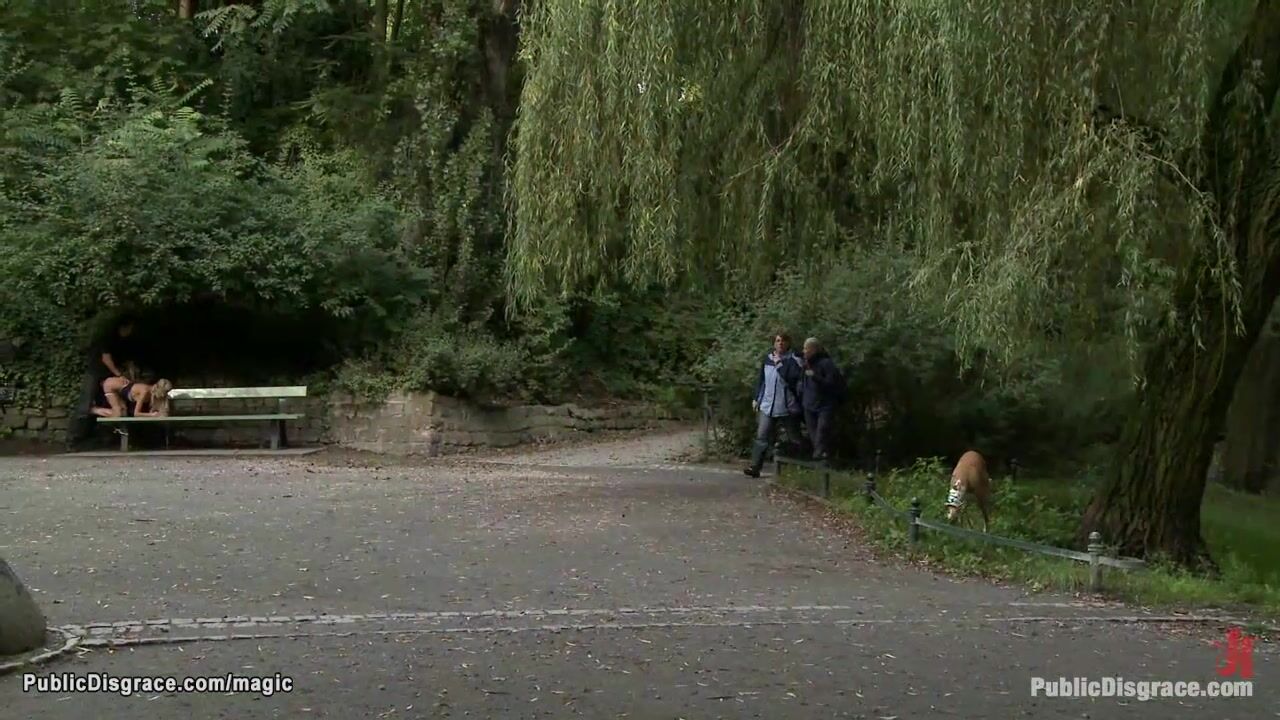 Bound and left nakes exposed in public Euro babe Blanche is humiliated then blindfolded in the park big cock fucked in doggy position by master Zenza Raggi