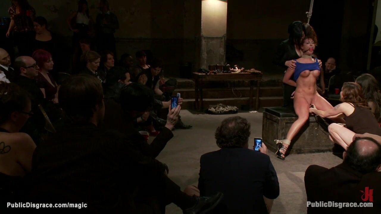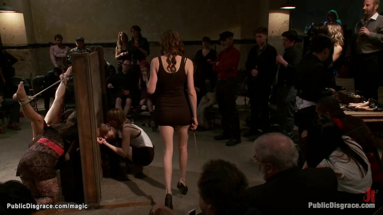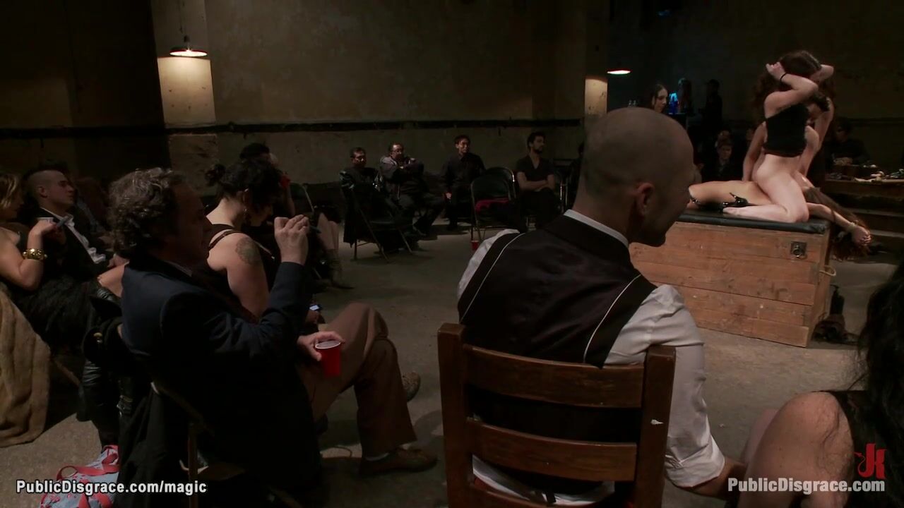 Two hot lesbian submissive babes Jiz Lee and Melissa Jacobs are fondled and tormented and fucked by all girl group in public place in front of horny strangers