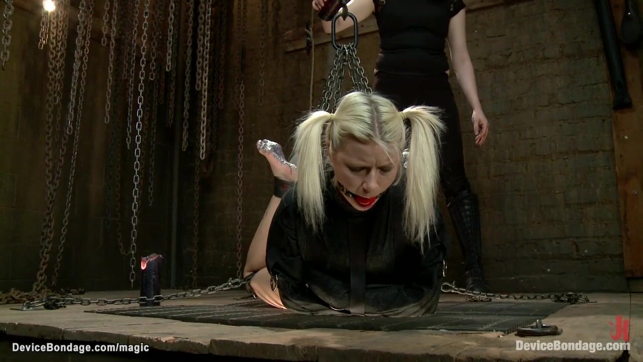 Hot blonde lesbian slave Anikka Albrite is bound in straitjacket and hogtied and suspended then candle waxed and vibrated till hooked up on sticky pads by lezdom Claire Adams