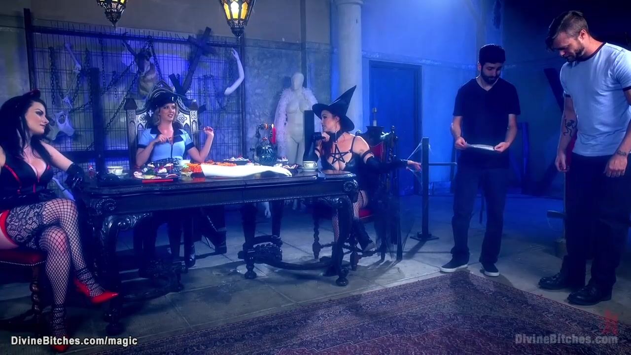 Cosplay femdoms with big tits Bella Rossi and Cherry Torn and Veruca James invited naive men Jay West and Mike Panic to Halloween party and fucked them with strap on dicks