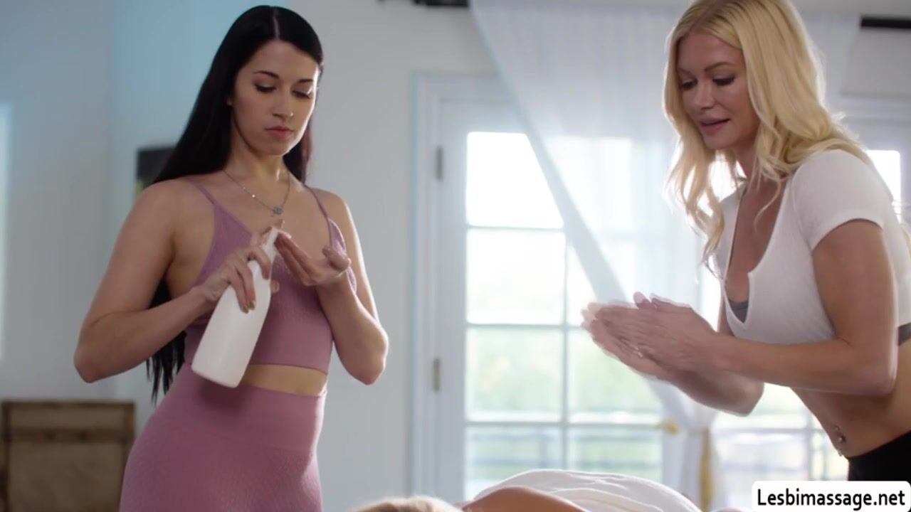 Hot blonde gets naked and she lets her wife and her masseuse massage her body passionately.After that,they decide to do threesome sex and they start kissing each other.Next is,they lick each others wet pussy so deep and hard.
