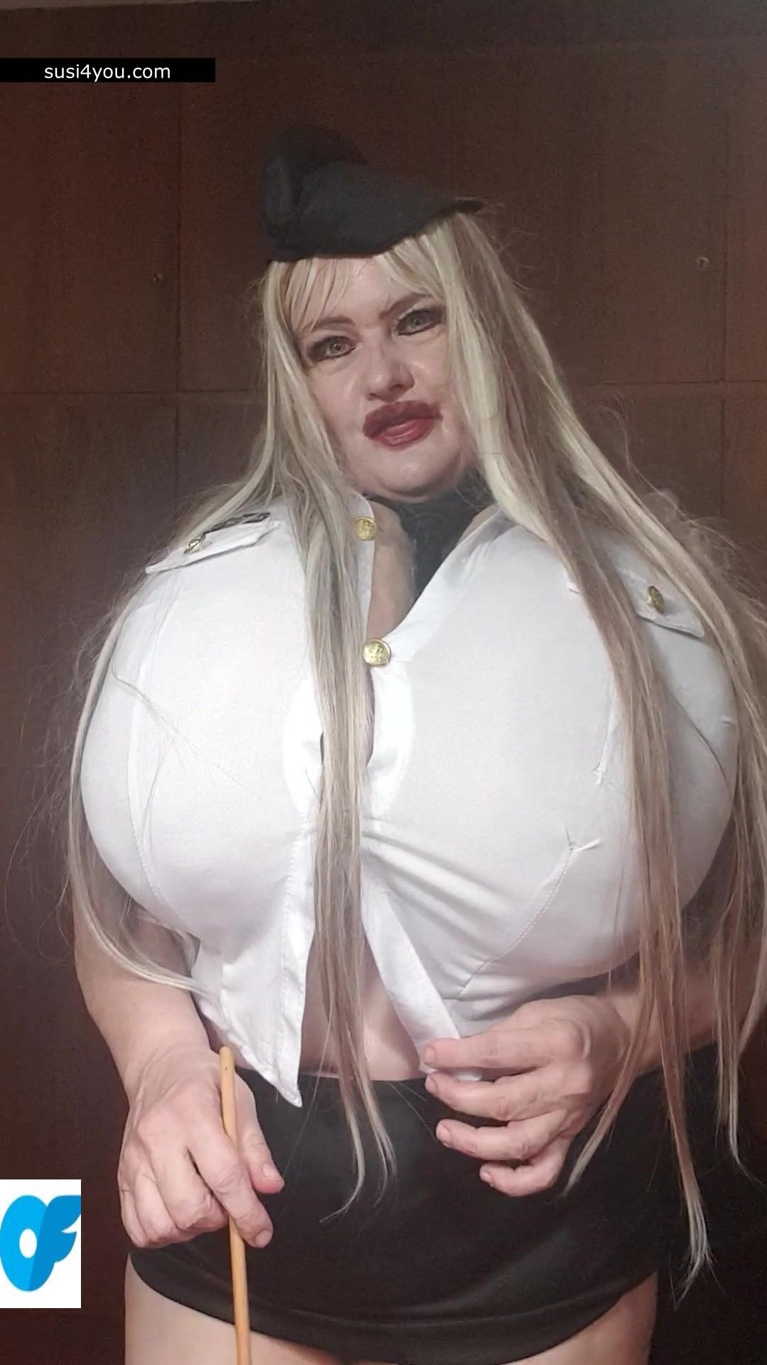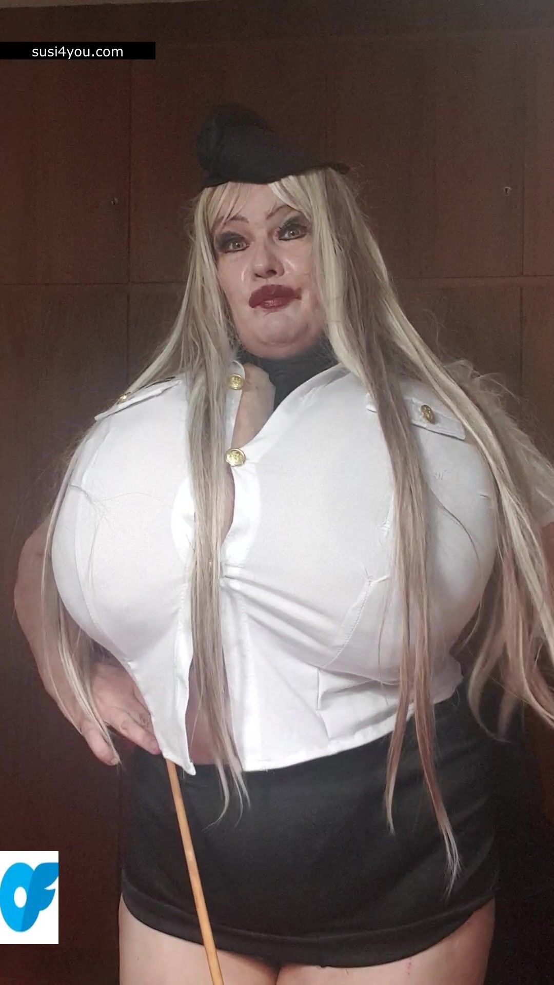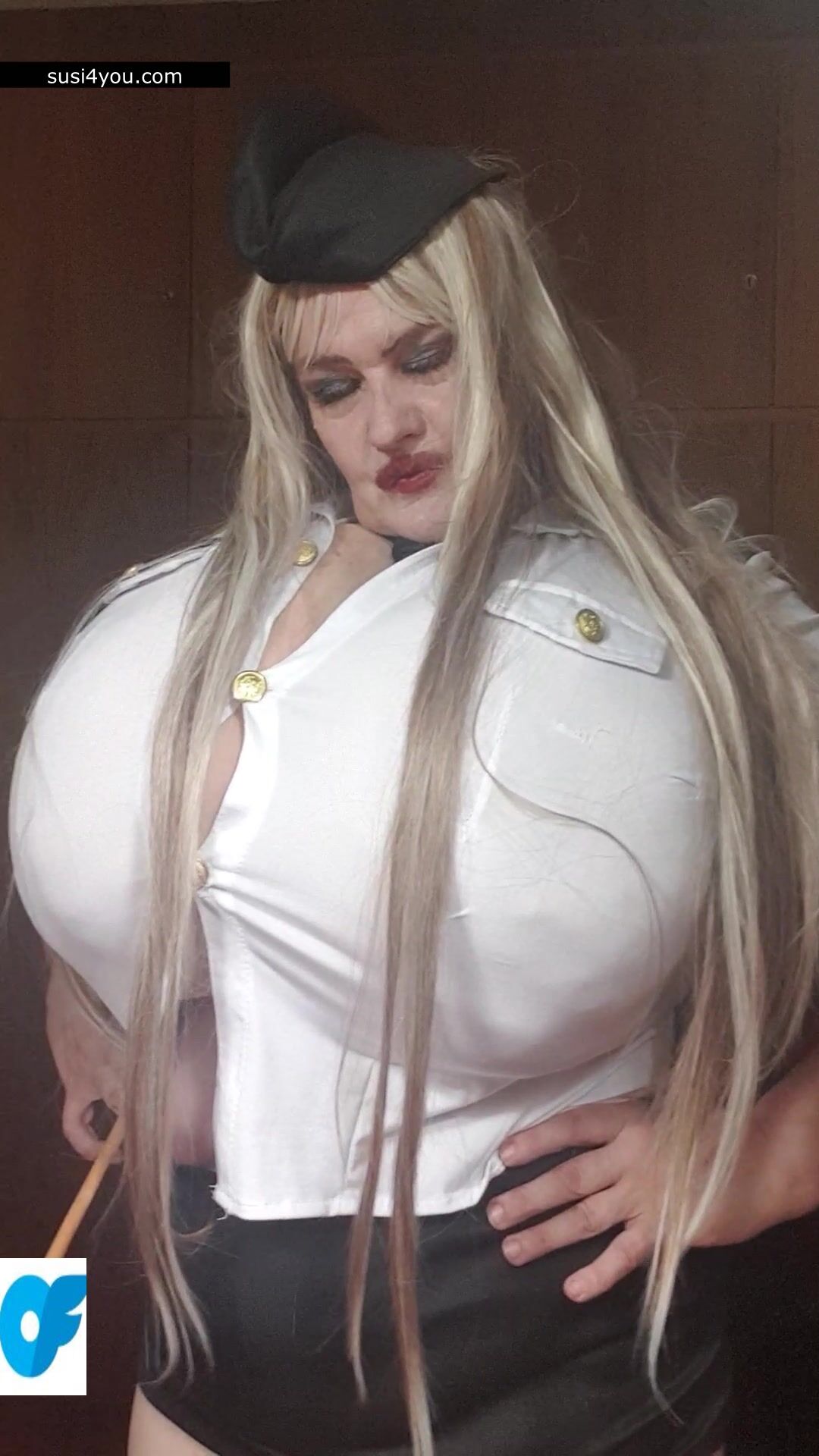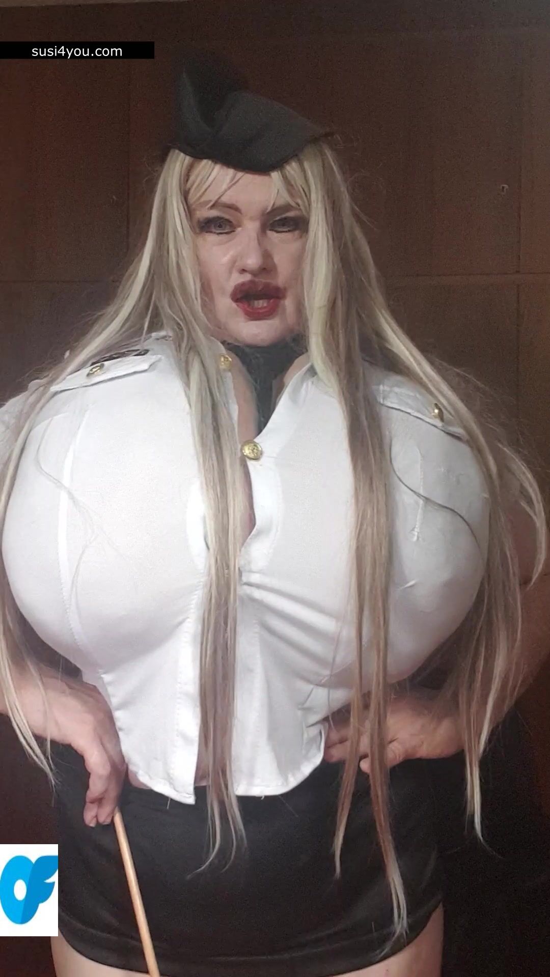 Susi is standing there with her huge cup k tits. She is wearing a policewoman costume and is talking to you in pov She is punishing you showing huge its and big pussy. You are parking wrong place and have to be punished