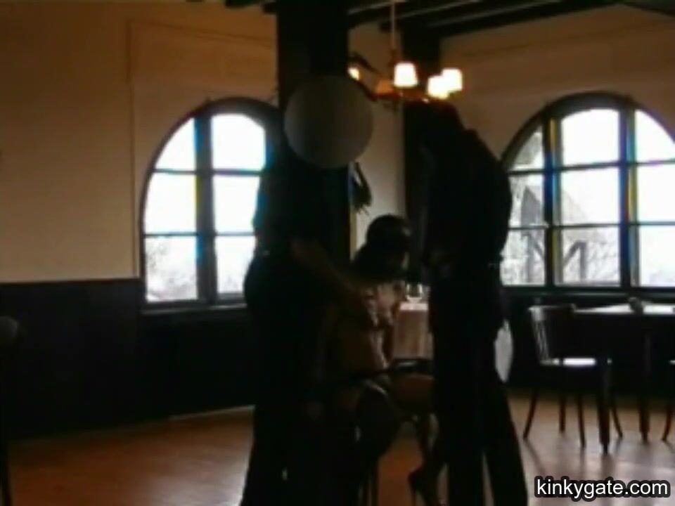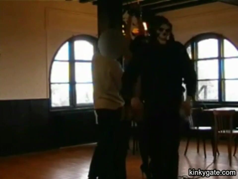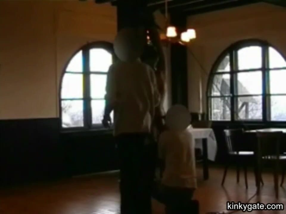 A BDSM party in my apartment with my tied up cum dump wife as a sexual utensil. She handles four cocks and gets her face soaked in jizz.