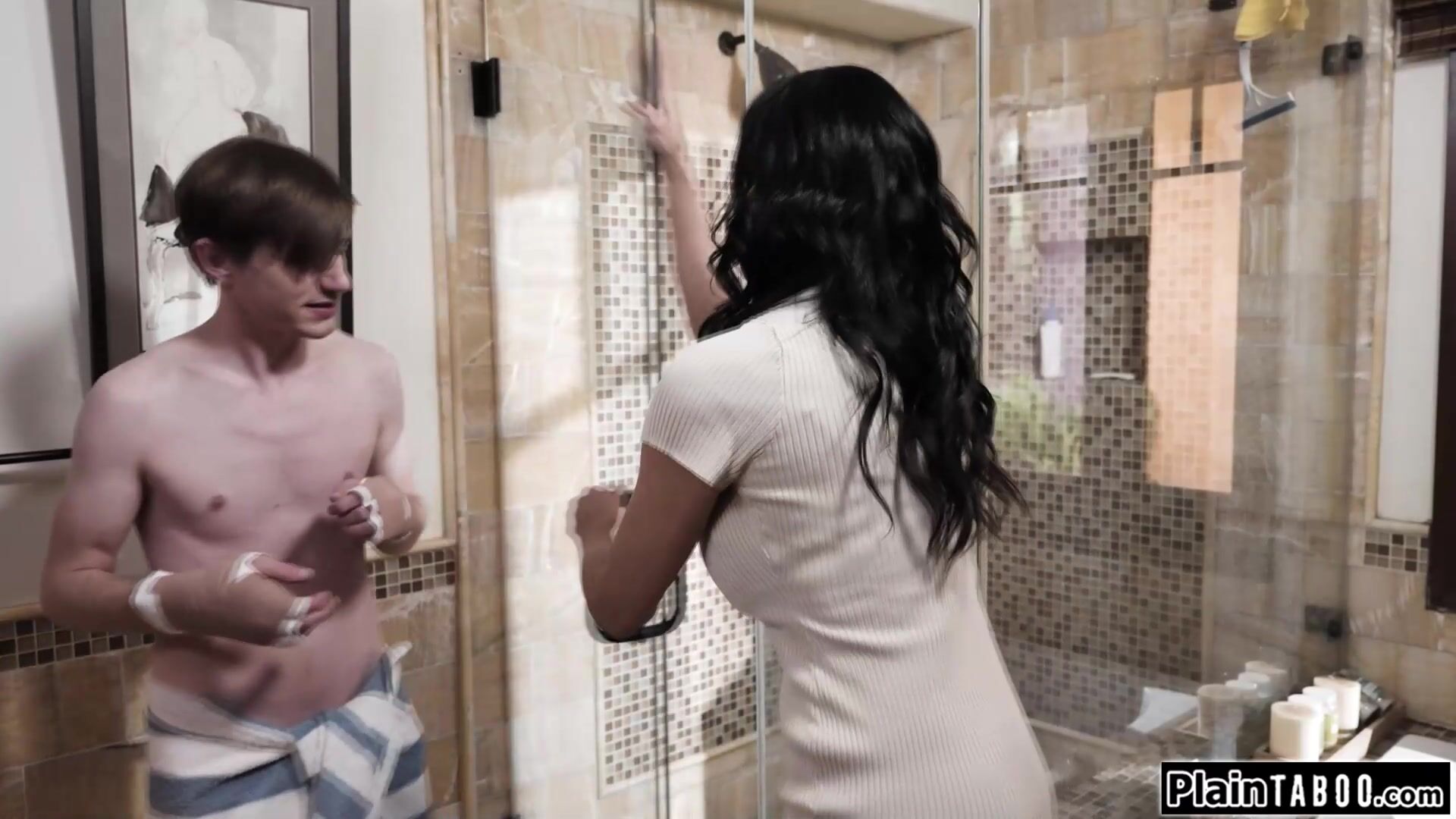 Big tits brunette stepmom puts her plan into action to fuck her stepson.The mature babe gets him naked on the bed and she grabs his hardon and deepthroats it.The milf sets her shaved pussy on his mouth for a facesitting oral and rides his hard cock
