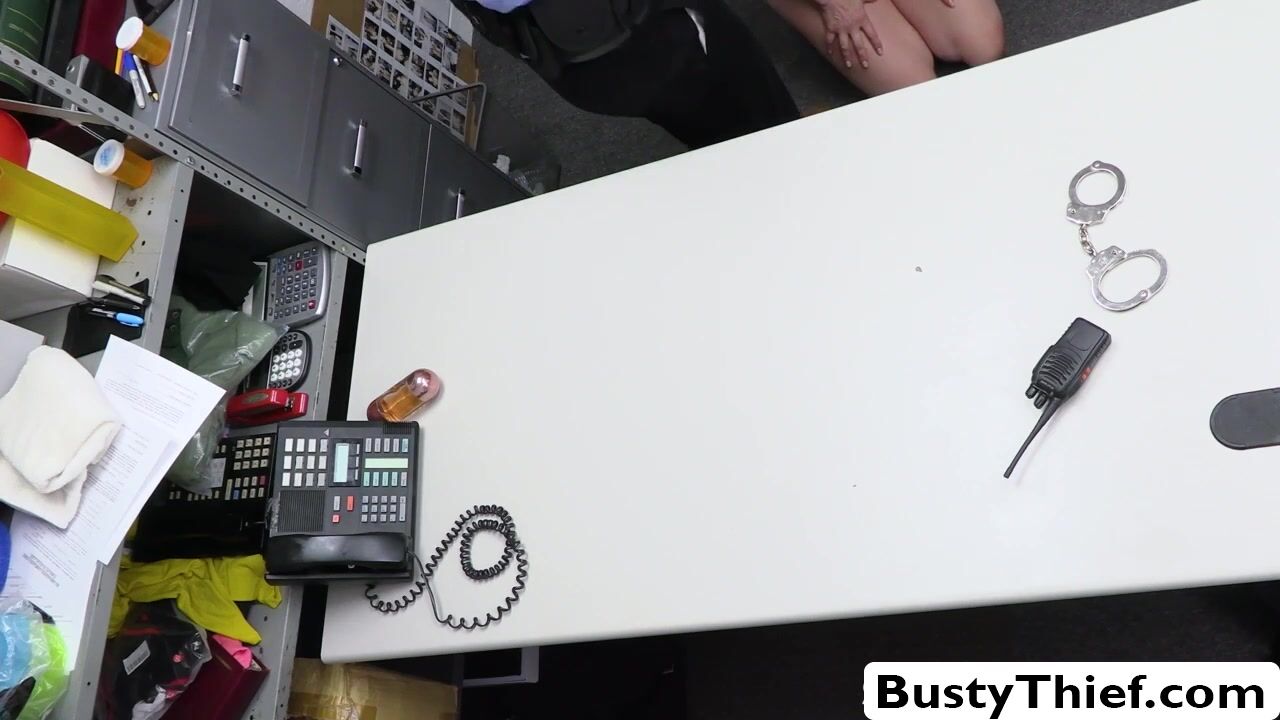 Busty blonde milf Ophelia Kaan finds out her husband is cheating so she tries to steal perfume but the police officer stops her. To avoid any issues, the big tits babe trades deepthroat blowjob his big cock and her pussy gets fucked on the desk as well.