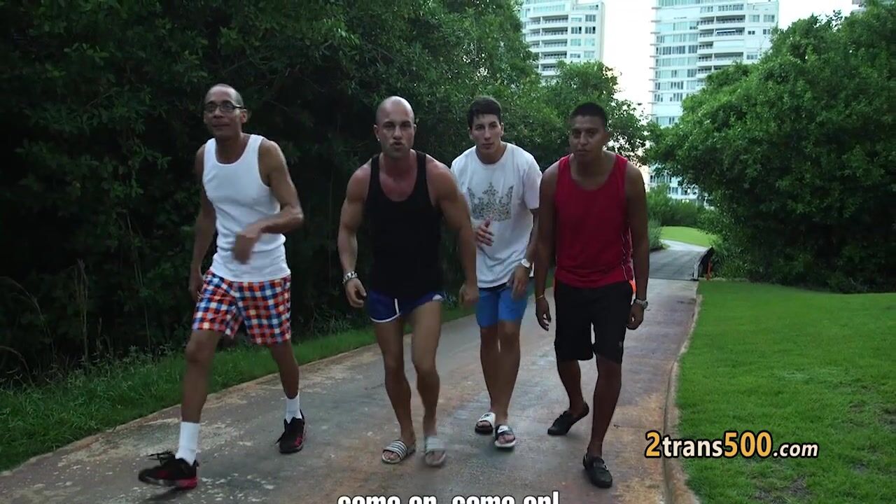 Four lucky guys found themselves big booty shemale slut eager for fuck She sucked their big hard cocks and got her tranny hole deep and hard fucked