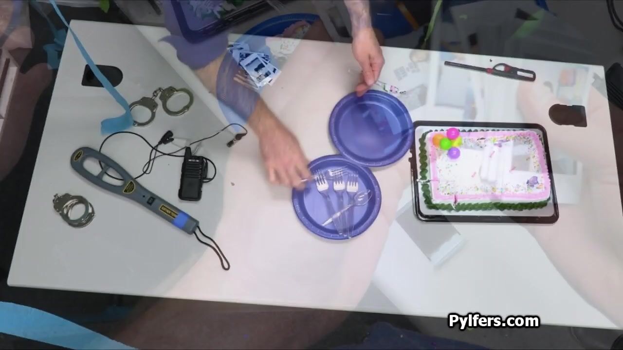 Seems like one of the security guards is saying goodbye, however a hot blonde ends up in the office. Just in time for a perfect gangbang party!