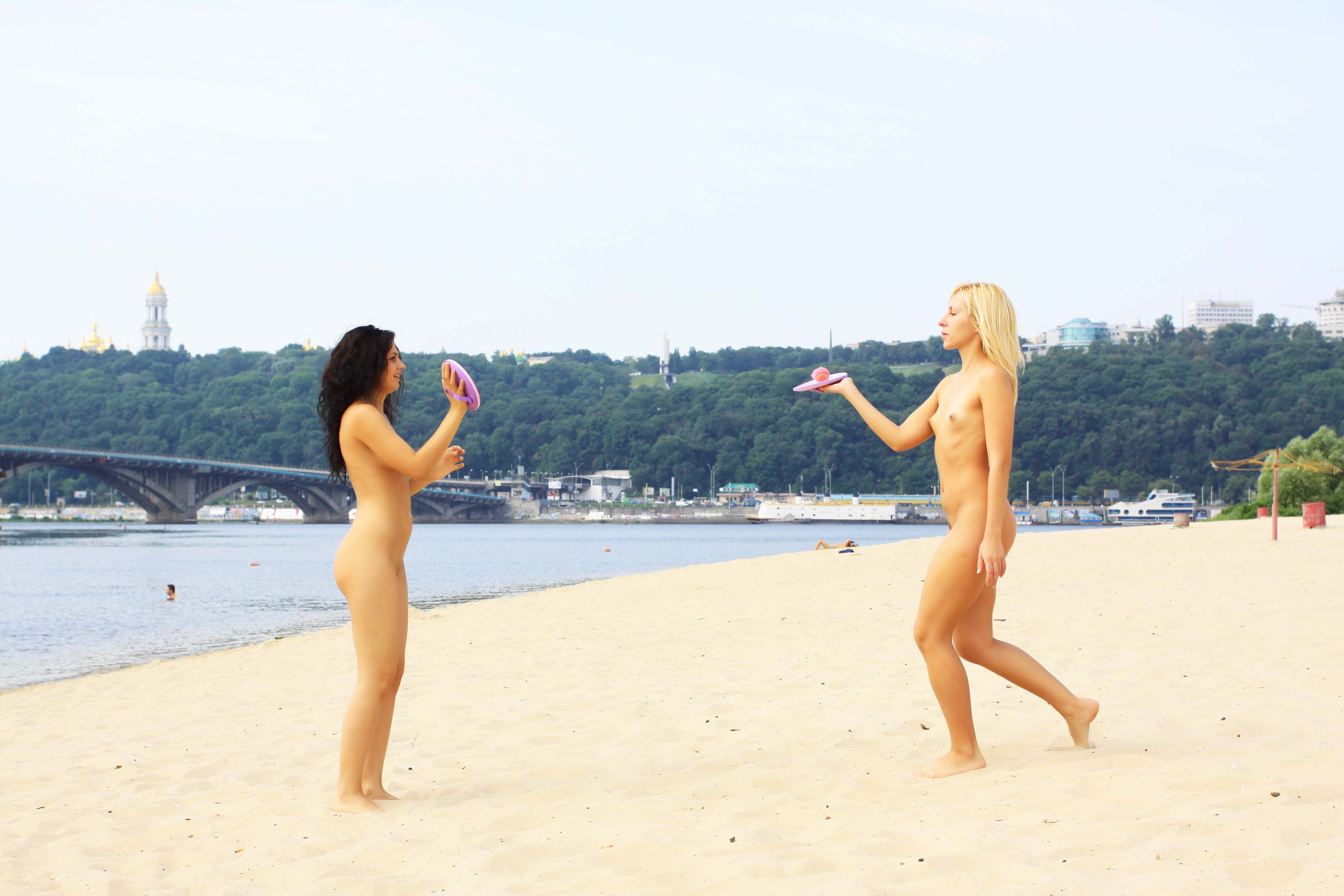 Stunning nudist teen playfully enjoys a sunny day at the beach