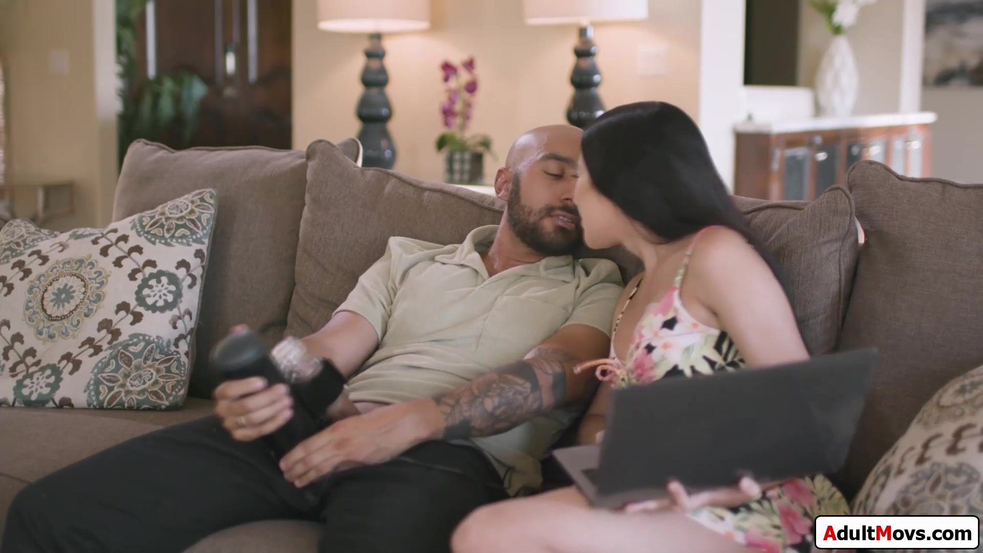 Gf walks in on her bf while he using a sextoy.The small tits petite brunette is intrigued and lets his titfuck her on the toy.She sucks his balls and gets a facesitting pussy licking while masturbating his dick with the toy before getting banged
