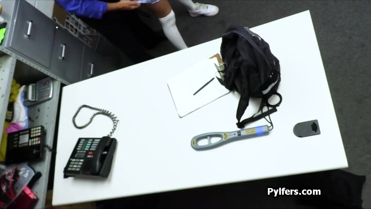 The security guard got really good eyes. He immediately found the stolen items in her panties. Now it was her time to pay for them and suck his dick!