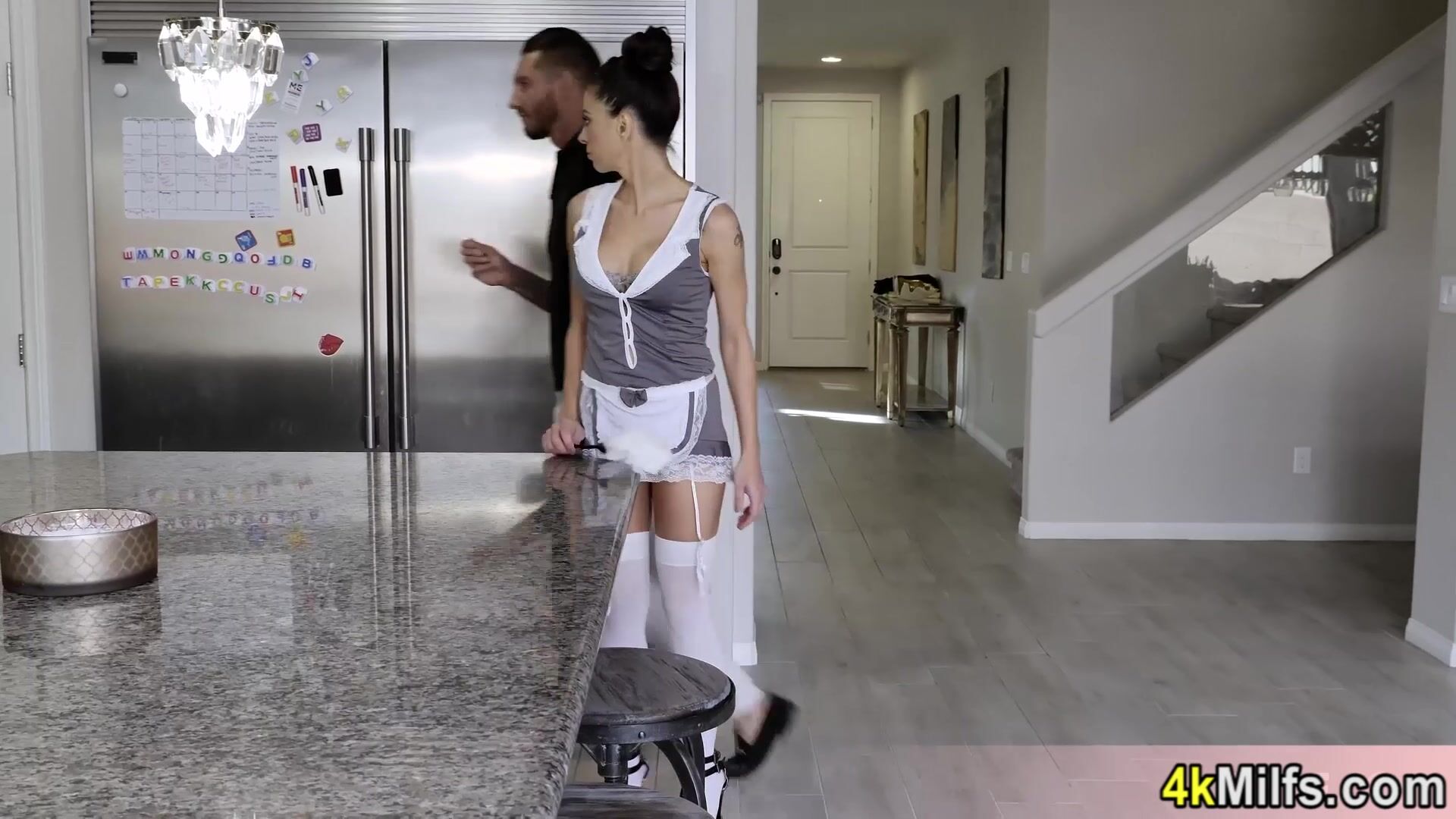 Skinny brunette MILF maid Eva Long with big boobs is cleaning the house in sexy uniform Her horny landlord comes and orders the petite slut to wax his big cock After the blowjob he is fucking her pierced pussy hard