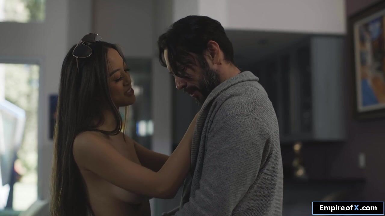 Petite brunette walks naked in her neighbors backyard.The guy gives her clothes but she wants to have fun.He kisses and sucks on her small tits while masturbating her clit.The asian babe blowjobs him before letting him fuck her shaved pussy.