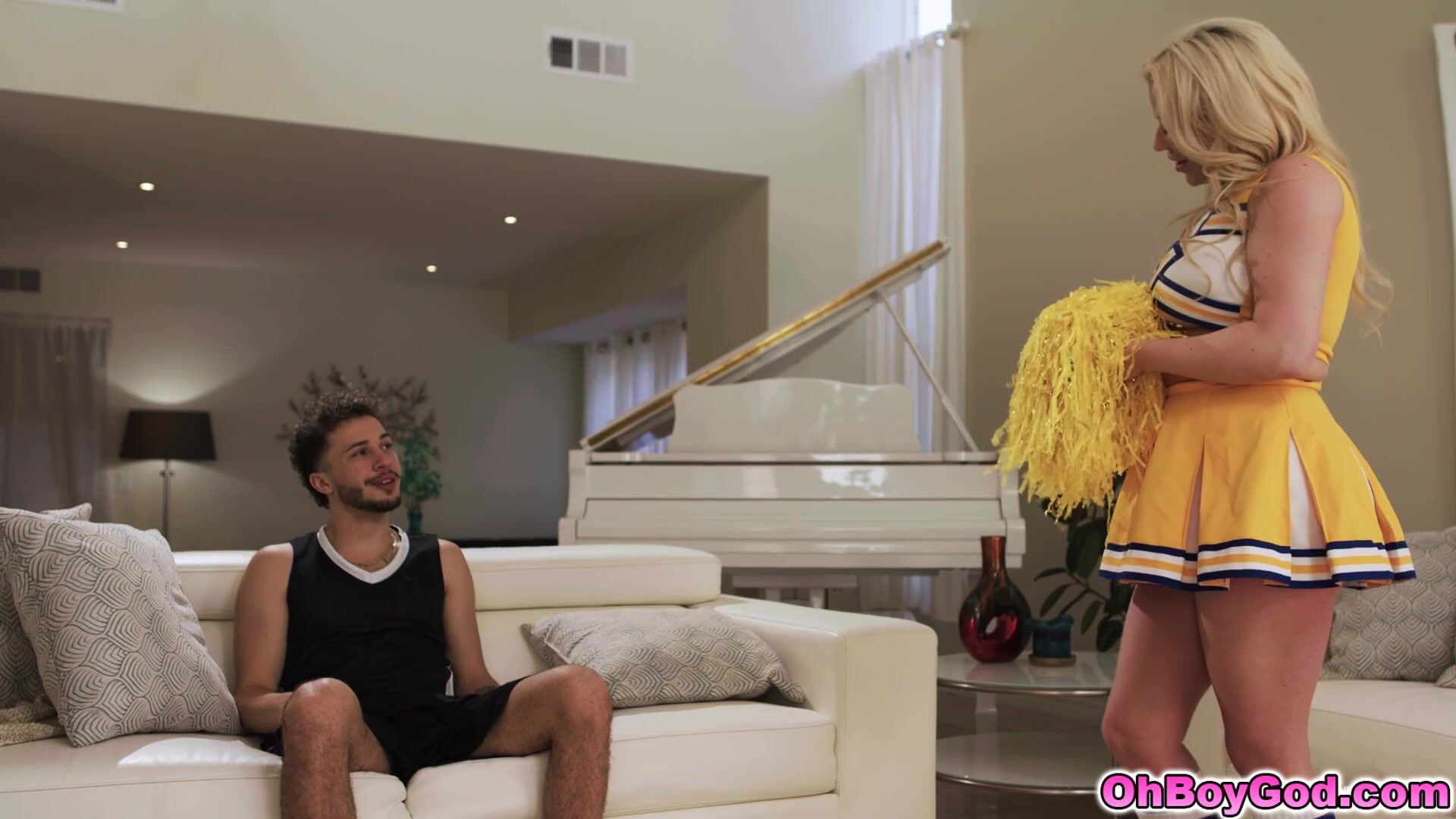 Mamma Mia! Stepmom Spencer Scott dressed up in her old cheerleader outfit, wants to cheer her stepson Apollo Banks up by performing a cute cheering routine which includes sucking her stepsons cock as his jaws DROPS!