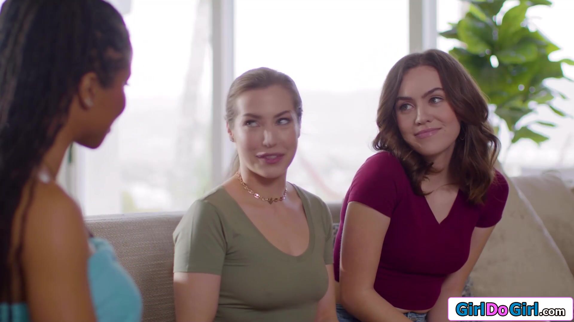 Virgin besties excited to have their first lesbian experience with their new big tits ebony neighbor.The busty black babe kisses them and the petite brunette watches her gf get eaten out.Then one licks the ebonys pussy while her bff gives her oral